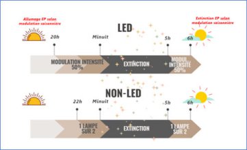 une réduction de l’intensité lumineuse sera appliquée de 20h à minuit, puis de 5h à 6h.